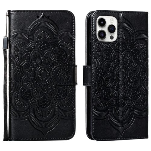 Pour iPhone 15 Pro Max Étui de téléphone en cuir à rabat horizontal avec motif de gaufrage Mandala (Noir)