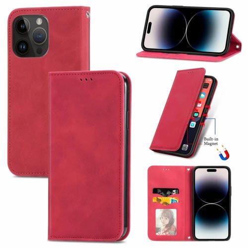 Funda para iPhone 15 Pro Max Retro Skin Feel Flip Magnética de Cuero (Rojo)
