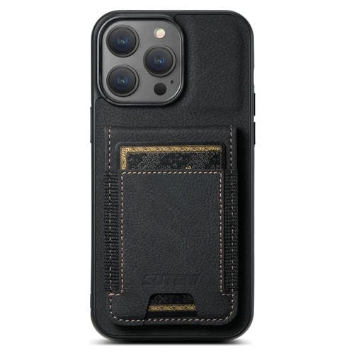 Funda para Teléfono Suteni H03 para iPhone 15 Pro con Soporte para Tarjeta de Cuero Litchi (Negro)