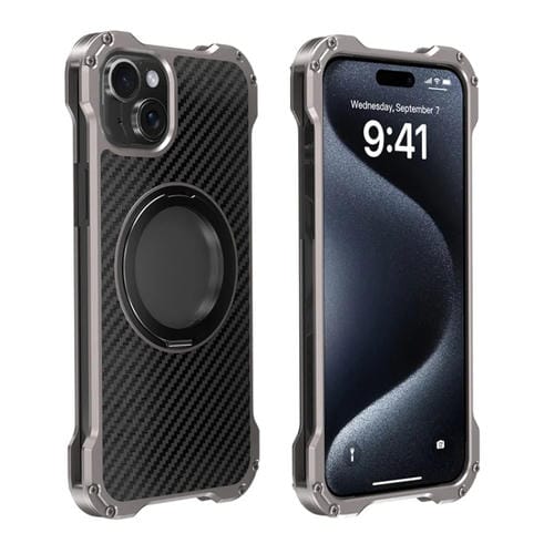 Caja de Teléfono Metal R-Just RJ51-1 para iPhone 15 con Soporte Giratorio Hueco (Gris Plateado)