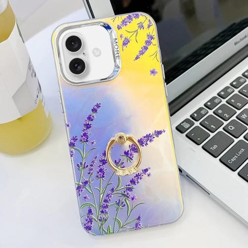 Caja de teléfono TPU para iPhone 16 con soporte de anillo y flor láser de galvanoplastia (Lavanda)