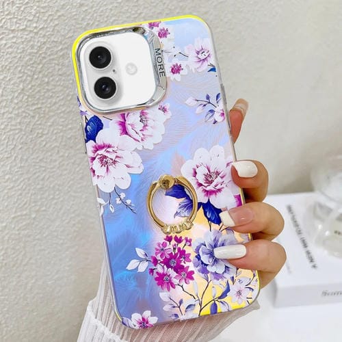 Caja de teléfono TPU para iPhone 16 con soporte de anillo y flor láser de galvanoplastia (Peony Ah11)