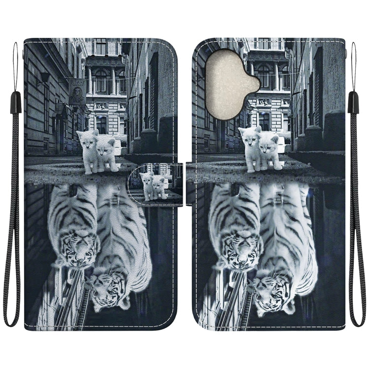 Funda para iPhone 16 Cuero Dibujo Coloreado Textura de Cristal (Reflejo de Tigre Gato)