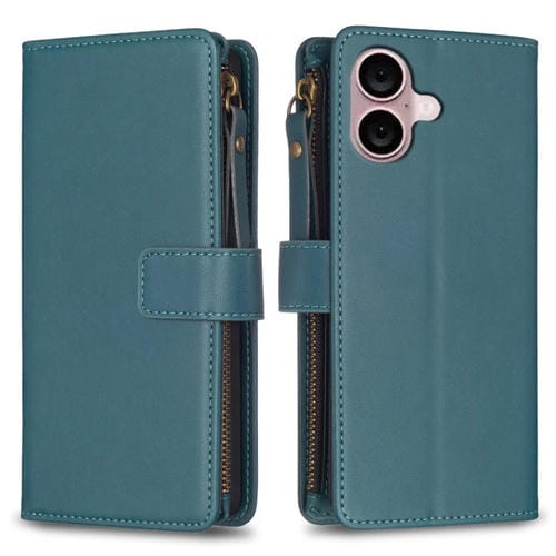 Funda Cartera para iPhone 16 Plus Cuero con 9 Ranuras para Tarjetas y Cremallera (Verde)