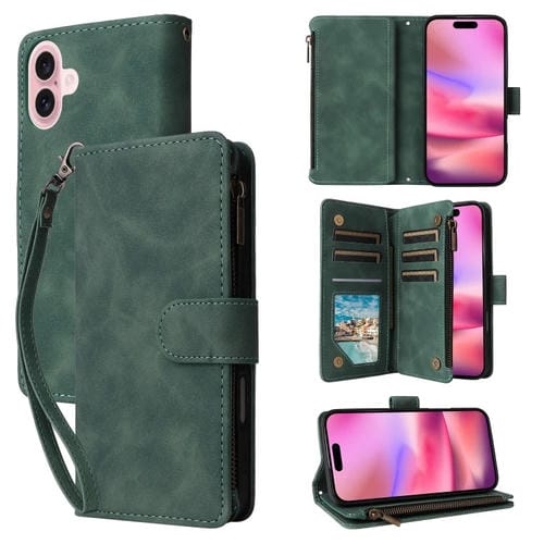 Funda Cruzada de Cuero para iPhone 16 Plus con Cremallera y Ranura para Tarjetas (Verde)