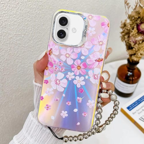 Funda para Teléfono iPhone 16 Plus Flor Láser Galvanizada con Correa para la Muñeca (Flor Rosa)