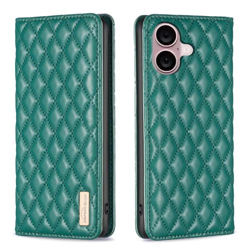 Funda para Teléfono iPhone 16 Plus con Tapa de Cuero Magnético Diamond Lattice (Verde)