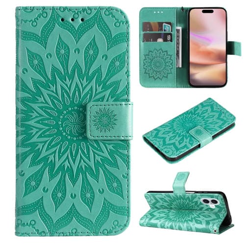 Funda para Teléfono iPhone 16 Plus Cuero con Tapa Patrón Girasol en Relieve (Verde)
