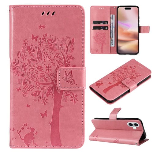Funda para Teléfono iPhone 16 Plus Cuero con Tapa Patrón En Relieve Árbol y Gato (Rosa)