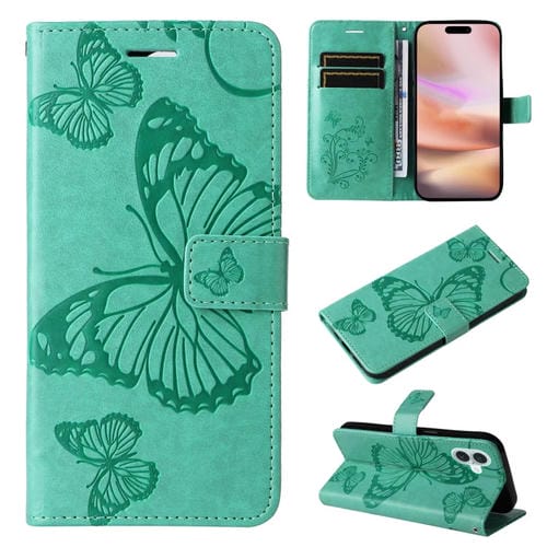 Funda para Teléfono iPhone 16 Plus Cuero con Tapa Patrón Mariposa 3D (Verde)
