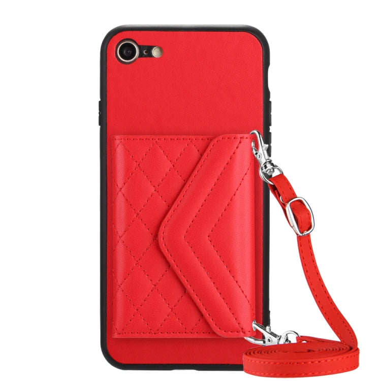 Pour iPhone SE 2022/SE 2020 Étui de téléphone RFID avec sac pour cartes à texture rhombique et longue lanière (rouge)