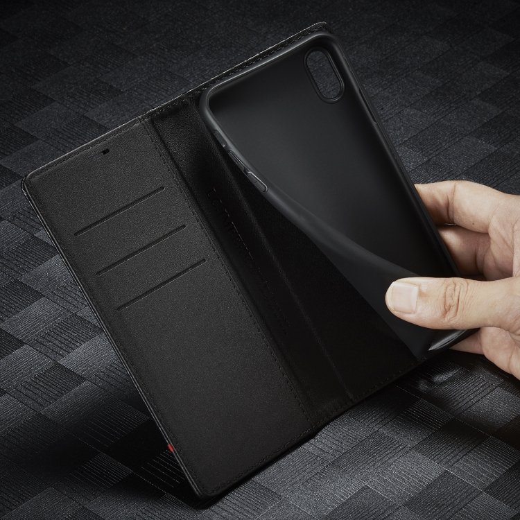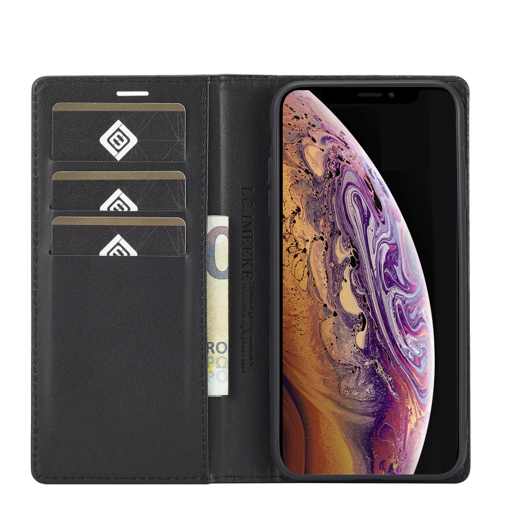 Funda para iPhone X / Xs Lc.Imeeke Cuero con Tapa Horizontal Fibra de Carbono Pu + TPU Soporte Ranura Tarjeta Billetera (Negro Horizontal)
