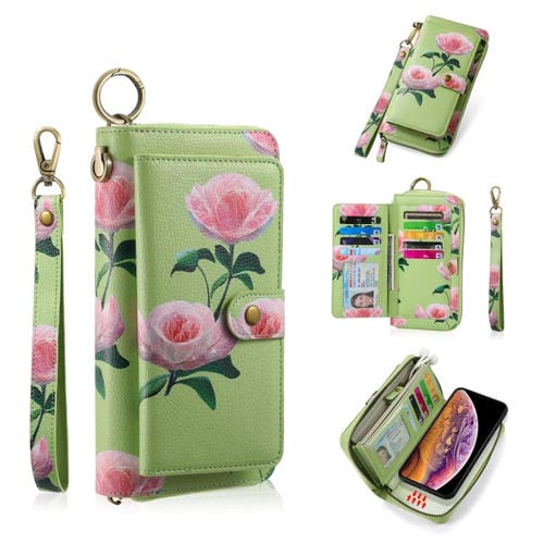 Funda de Cuero Pola Flower para iPhone X Xs con Billetera y Cremallera Multifuncional (Verde)