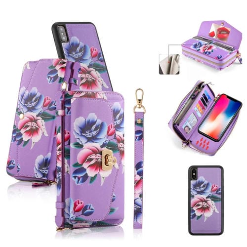Funda de Cuero Pola Flower para iPhone X / Xs con Billetera Cruzada Multifuncional y Cremallera (Púrpura)