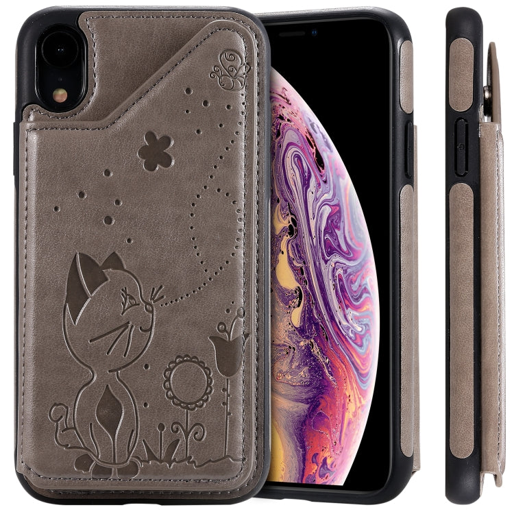 Estuche protector para iPhone Xr Cat Bee patrón en relieve con ranuras para tarjetas y marco de fotos (Gris)