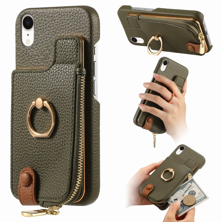 Funda Trasera para iPhone Xr con billetera, cremallera y anillo de cuero litchi (Verde)
