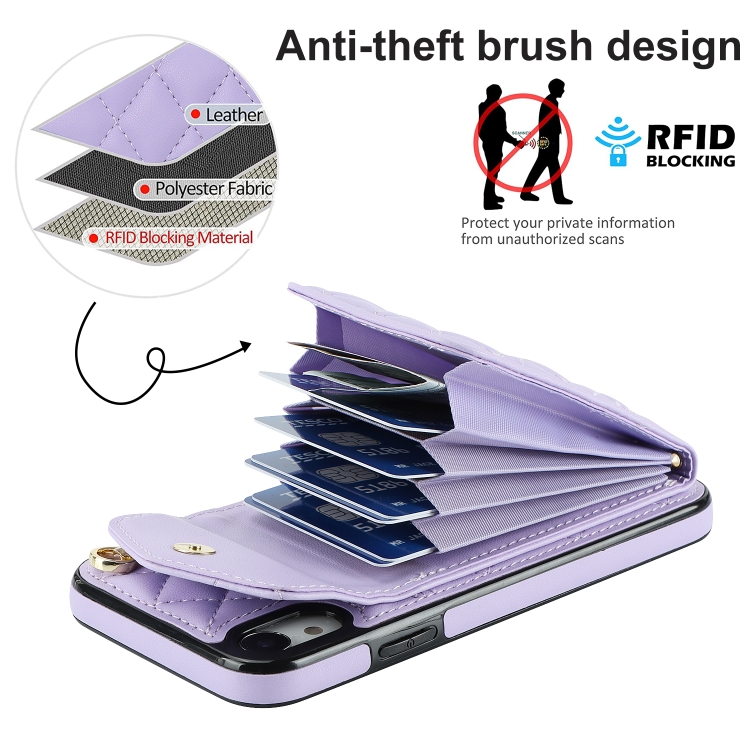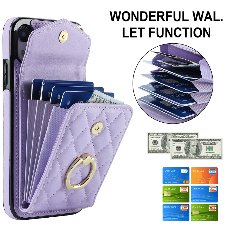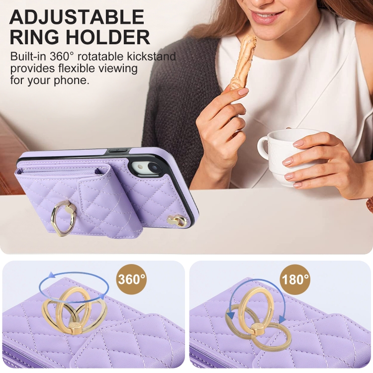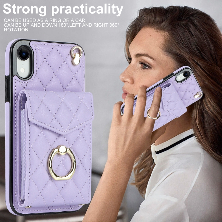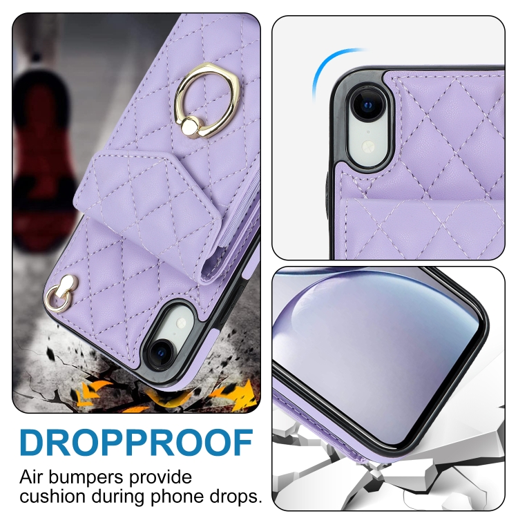 Funda para Teléfono iPhone Xr Rhombic Texture Card Bag con Cordón Largo (Púrpura Claro)