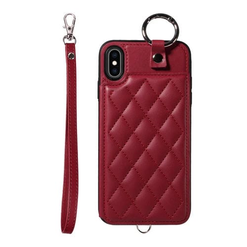 Estuche para Teléfono iPhone Xs Max Bolsa para Tarjetas Textura Rómbica Cordón Corto (Rojo Vino)