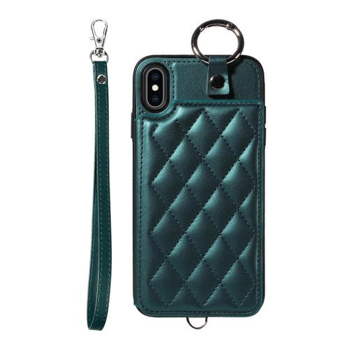 For iPhone XS Max Phone Case with Rhombic Texture Card Bag and Short Lanyard (Green)