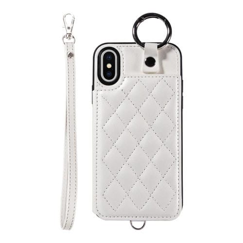 Estuche para Teléfono iPhone Xs / X con Bolsa para Tarjetas Textura Rómbica y Cordón Corto (Blanco)