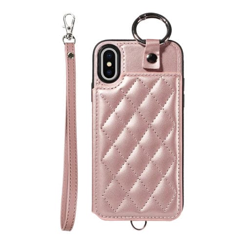 Estuche para teléfono iPhone Xs / X con bolsa para tarjetas textura rómbica y cordón corto (Oro Rosa)