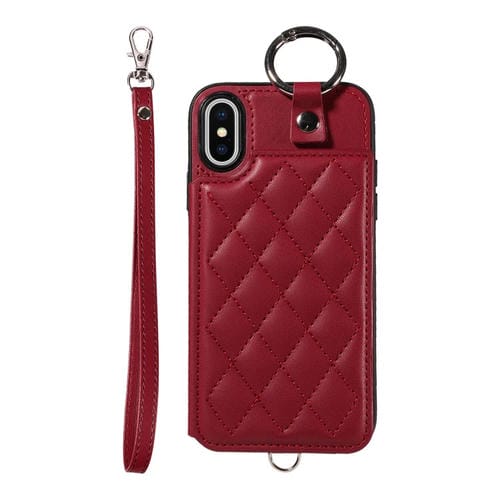Estuche para Teléfono iPhone Xs X con Bolsa para Tarjetas Textura Rómbica y Cordón Corto (Rojo Vino)
