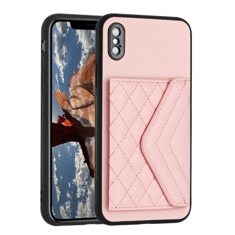 Pour étui de téléphone RFID iPhone XS/X avec sac pour carte à texture rhombique et longue lanière (or rose)