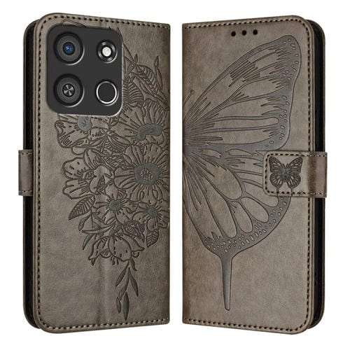Funda de Cuero para Itel A05S con Mariposa en Relieve (Gris)