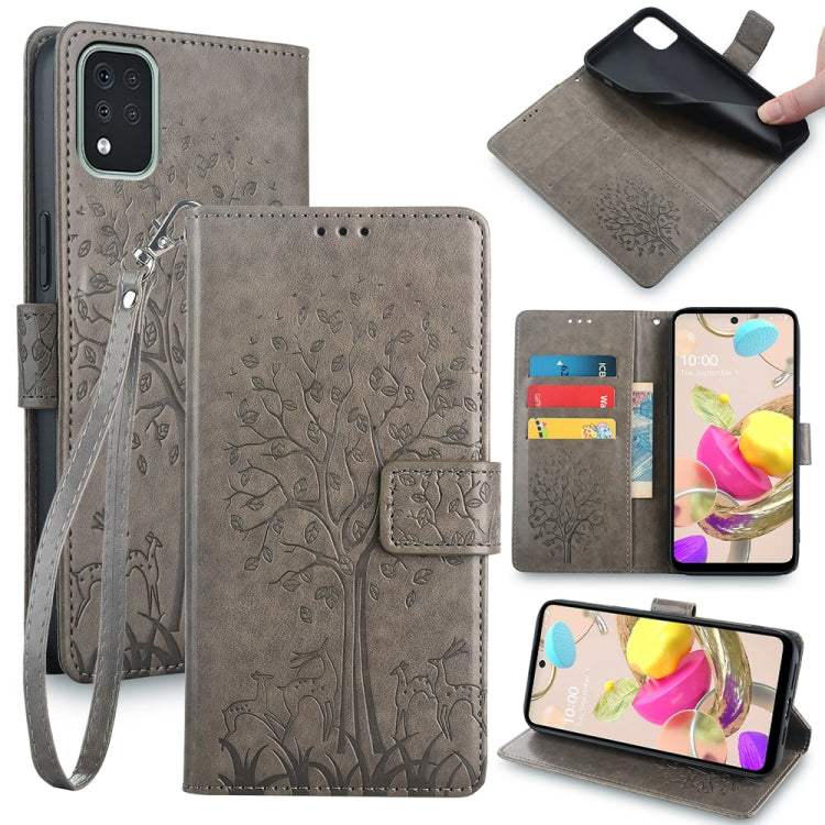 Funda de Cuero para LG K42 con Relieve de Árbol y Ciervo (Gris)