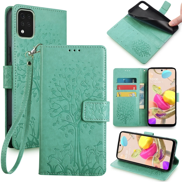 Funda para Teléfono LG K42 de Cuero con Relieve de Árbol y Ciervo (Verde)