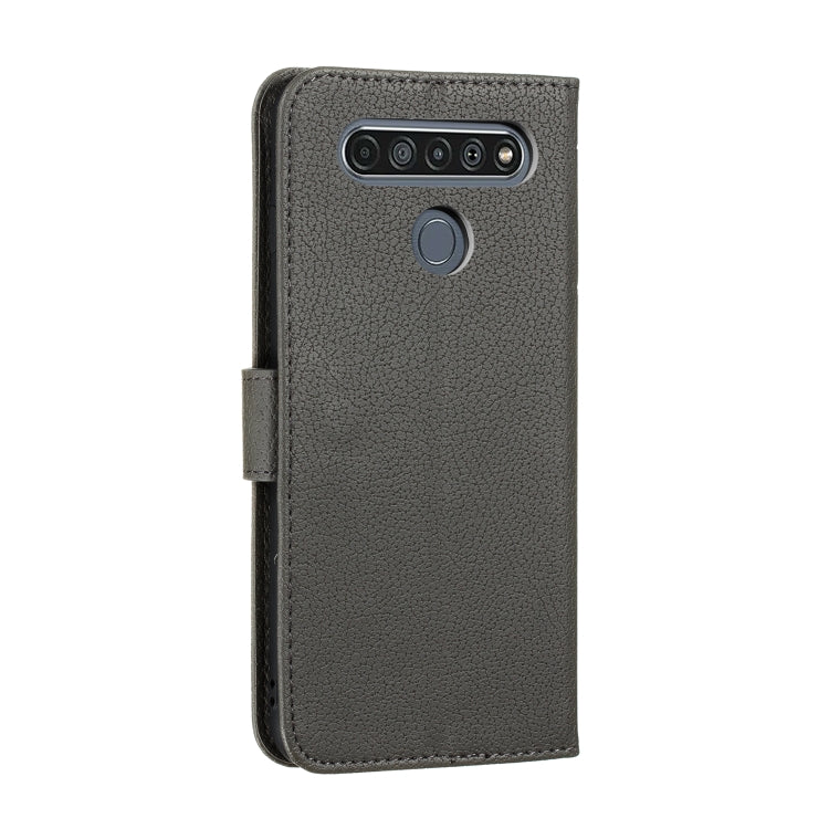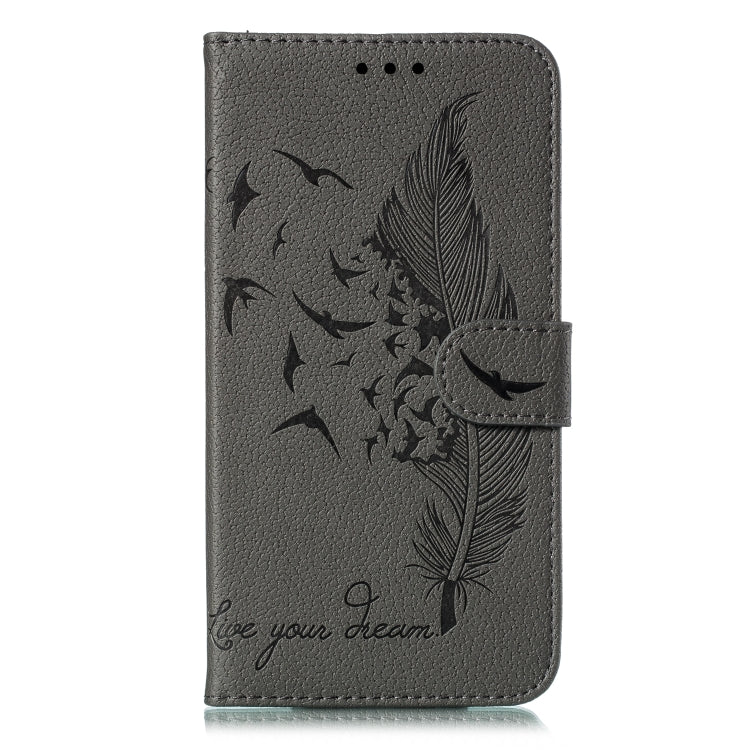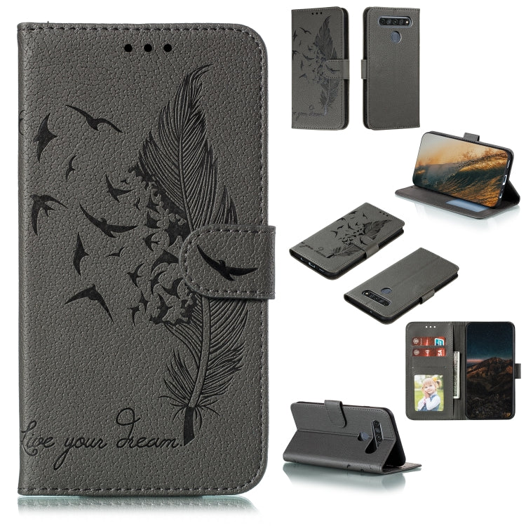 Funda de Cuero para LG K61 con Tapa Horizontal, Textura de Litchi, Diseño de Plumas, Billetera y Soporte (Gris)
