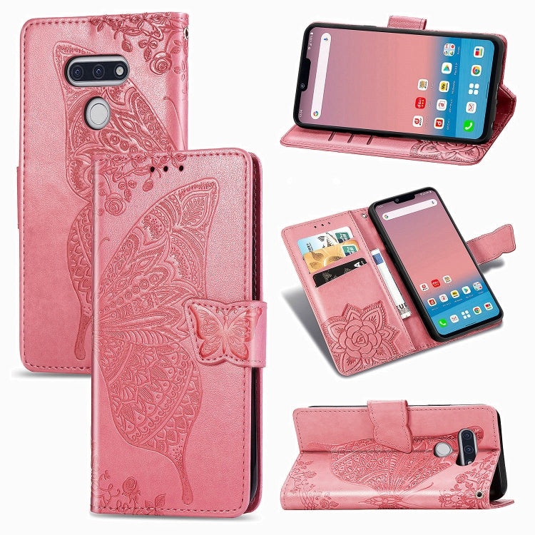Funda de Cuero para LG Style3 L-41A Butterfly Love Flower con Tapa Horizontal, Soporte, Ranura para Tarjeta y Cordón (Rosa)