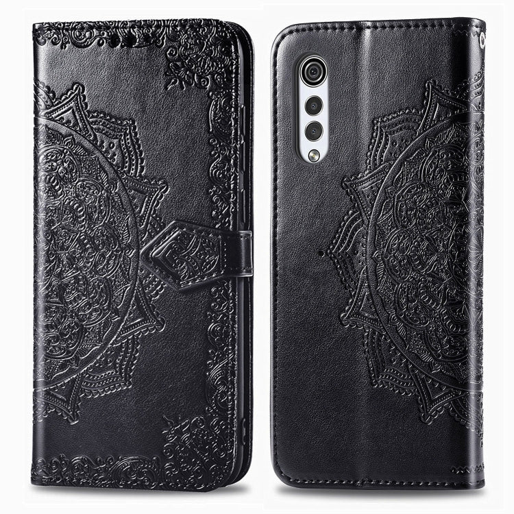 Funda de Cuero LG Velvet 5G Mandala Flower con Tapa Horizontal, Soporte, Ranura para Tarjeta y Cordón (Negro)