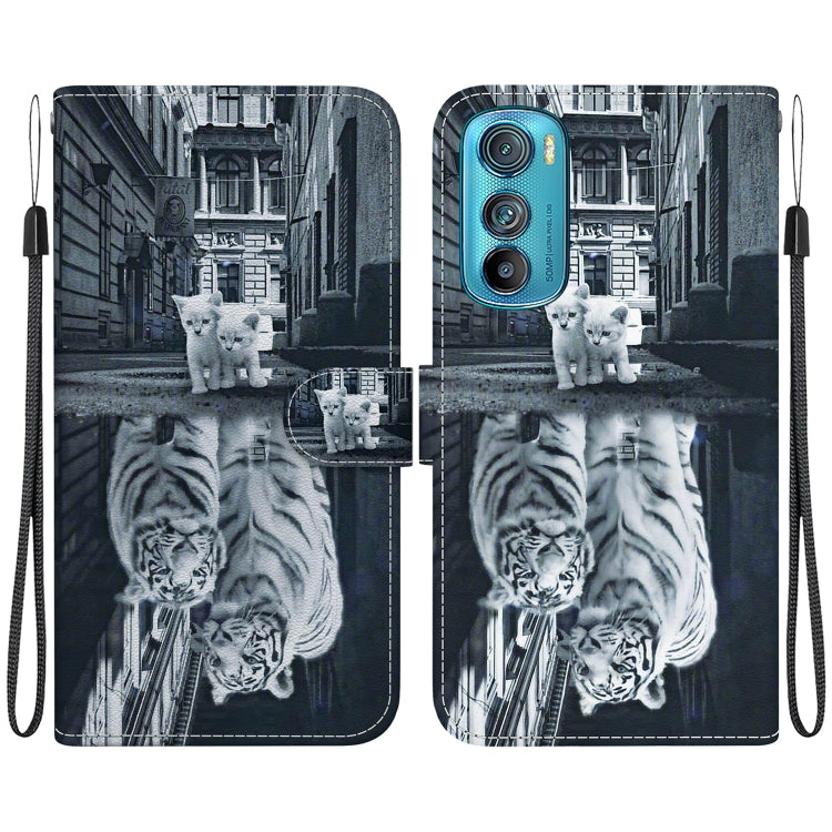 Funda de Cuero para Motorola Edge 30 con Dibujo Coloreado y Textura de Cristal (Reflejo de Tigre Gato)