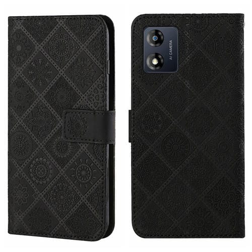 Funda de Cuero para Motorola Moto E13 con Patrón en Relieve Estilo Étnico (Negro)