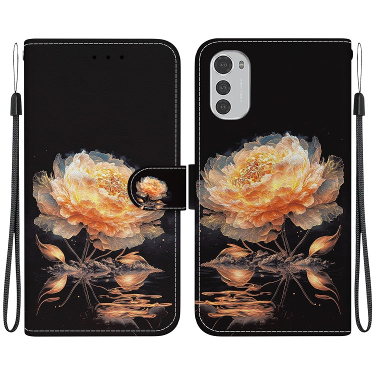 Estuche de Cuero para Motorola Moto E32 con Dibujo Coloreado y Textura de Cristal (Peonía Dorada)
