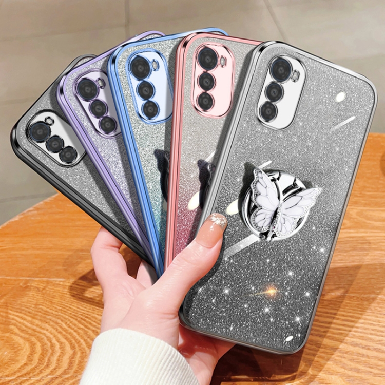 Funda TPU para Motorola Moto E32 con Soporte de Mariposa y Brillo Degradado (Plata)