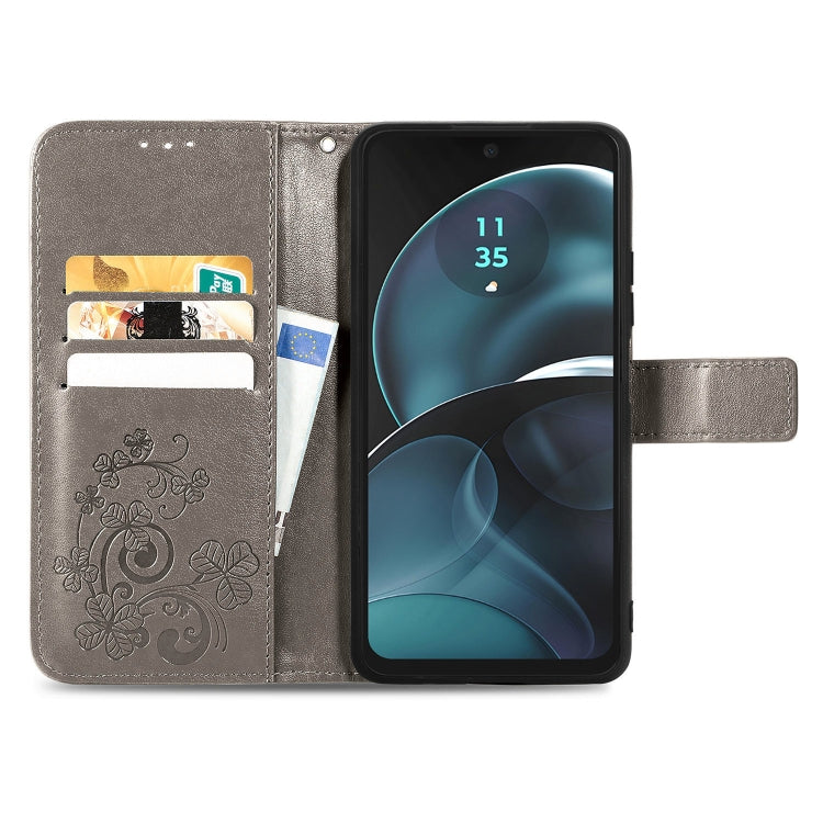 Funda de Cuero Repujado para Motorola Moto G14 con Cierre de Cuatro Hojas (Gris)
