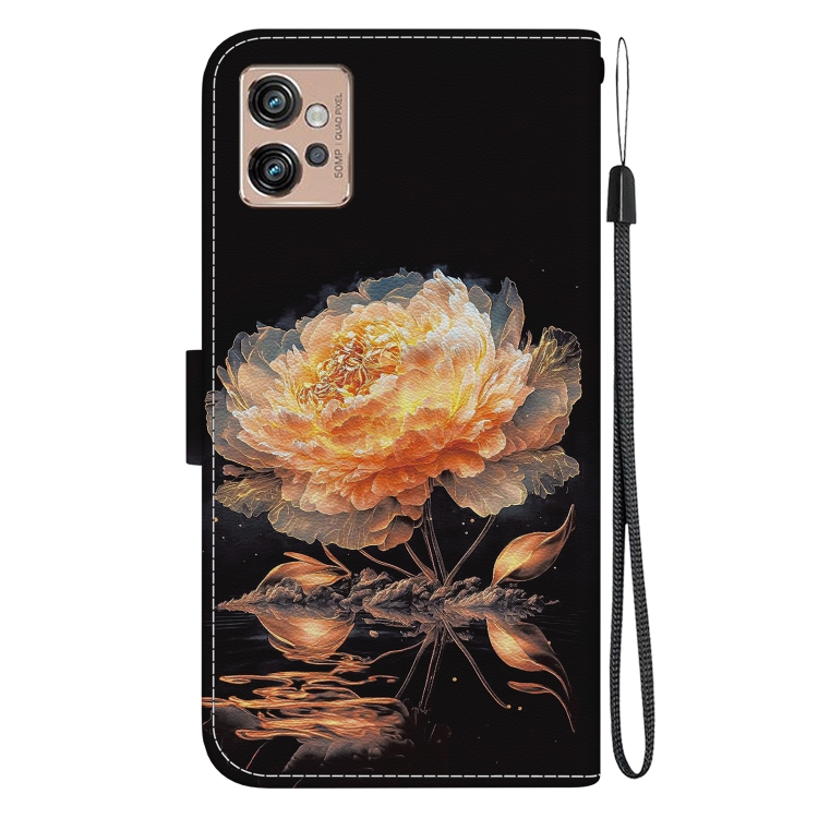 Funda de Cuero para Motorola Moto G32 con Dibujo Coloreado y Textura de Cristal (Peonía Dorada)