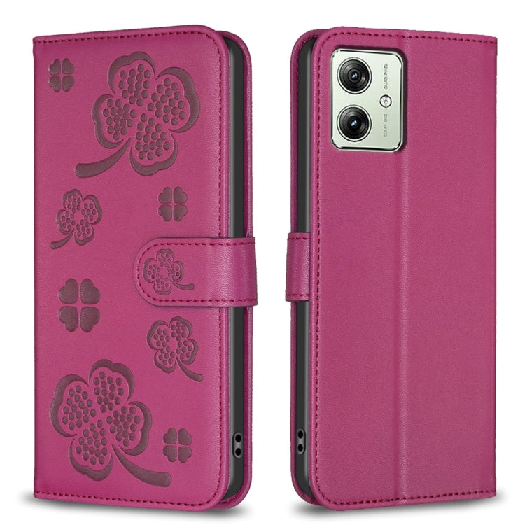 Funda para Motorola Moto G54 5G Eu Edition de Cuero con Relieve de Cuatro Hojas (Rojo Rosa)