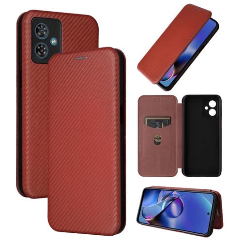 Funda de Cuero para Motorola Moto G54 5G con Tapa y Textura de Fibra de Carbono (Marrón)