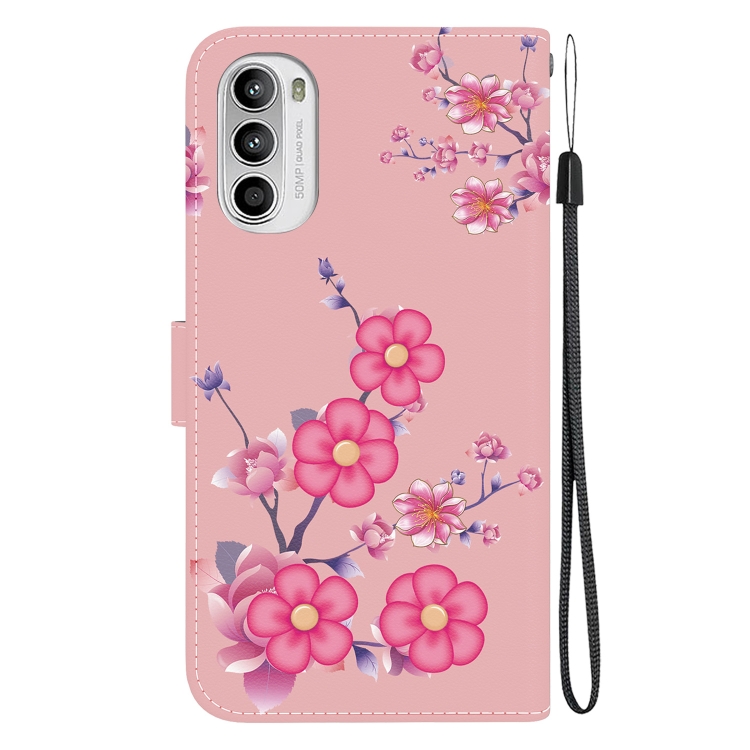 Funda de Cuero para Motorola Moto G62 5G con Dibujo Coloreado y Textura de Cristal (Flores de Cerezo)