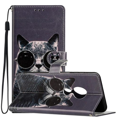 Funda de Cuero para Motorola Moto G7 Power con Dibujo Colored Drawing (Gafas de Sol Cat)
