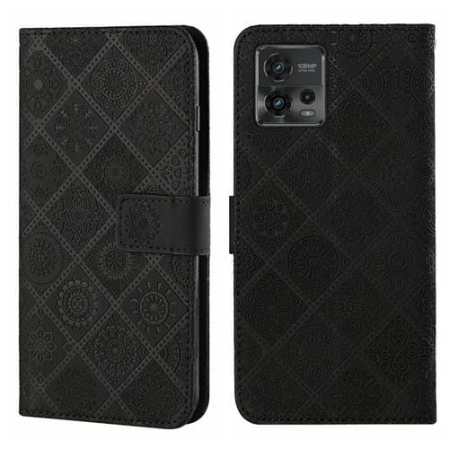 Funda de Cuero para Motorola Moto G72 con Patrón en Relieve Estilo Étnico (Negro)