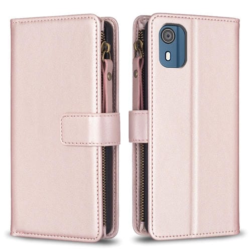 Funda de Cuero para Nokia C02 con 9 Ranuras para Tarjetas y Cremallera con Tapa (Oro Rosa)