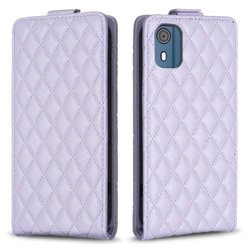 Funda de Cuero para Nokia C02 con Tapa Vertical y Diseño Diamond Lattice (Púrpura)