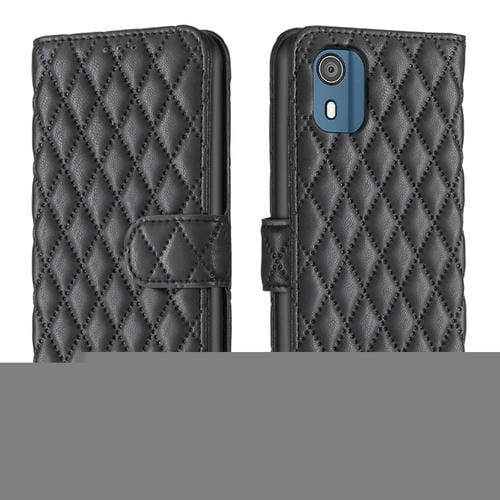 Funda Wallet Flip de Cuero para Nokia C02 con Diseño Diamond Lattice (Negro)