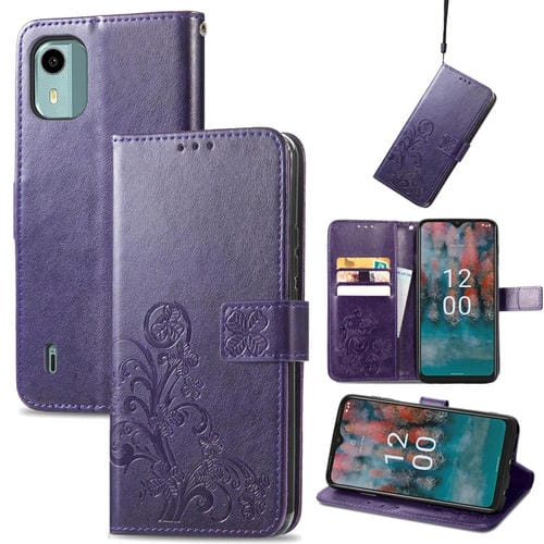 Estuche para Teléfono Nokia C12 de Cuero con Hebilla en Relieve y Cierre de Cuatro Hojas (Púrpura)