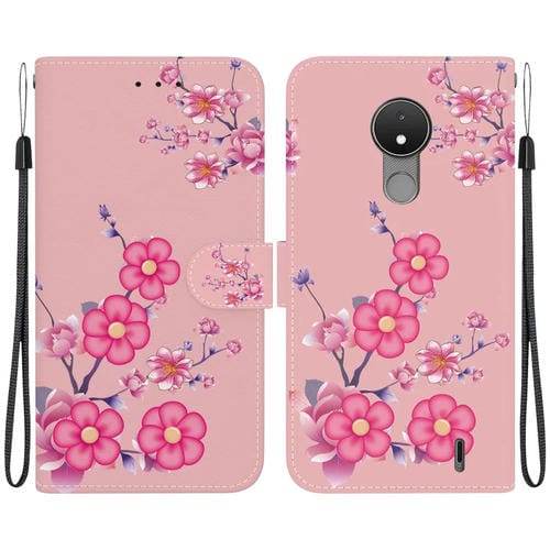 Funda para Nokia C21 de Cuero con Dibujo Coloreado y Textura de Cristal (Flores de Cerezo)