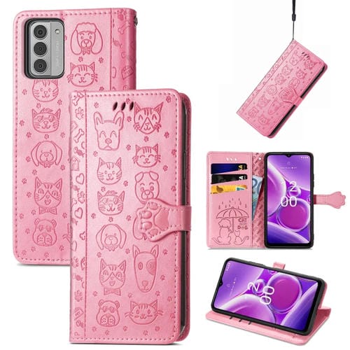Funda para Teléfono Nokia G42 de Cuero con Relieve de Perro y Gato (Rosa)